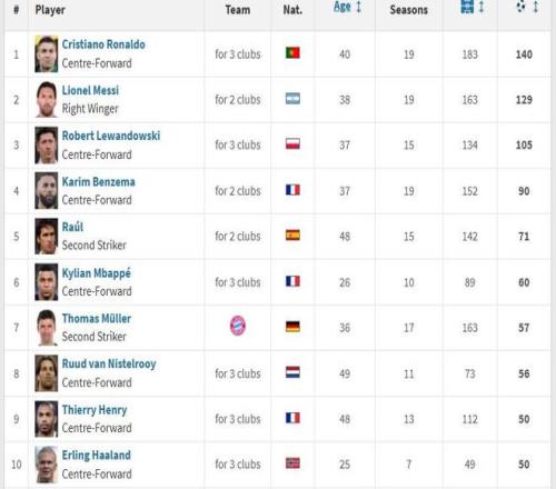 欧冠历史射手榜前十
