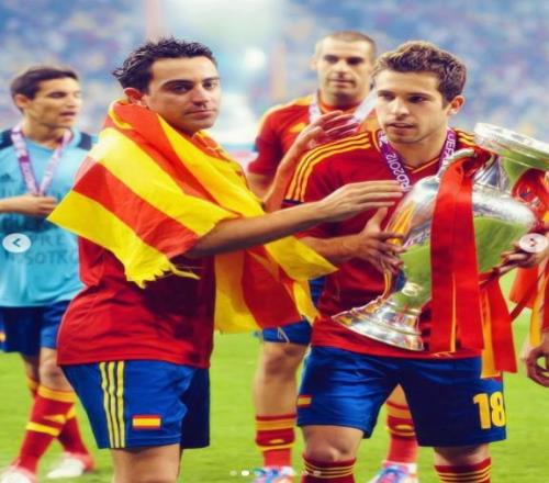 哈维和阿尔巴不仅在巴萨、西班牙国家队做过队友,哈维后来还在巴萨执教过阿尔巴。