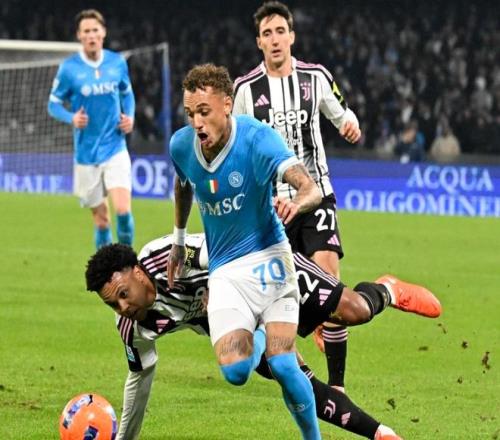 比赛刚刚开始不久,麦克托米奈门前抢点头球攻门,只可惜顶偏了。第7分钟,那不勒斯进球了!内雷斯埃禁区右侧送出横传,霍伊伦门前包抄射门,球进了!那不勒斯获得梦幻般的开局。第20分钟,伊尔迪兹外围尝试一脚远射,踢飞了。6分钟后,迪洛伦佐头球攻门被门将神奇化解。随后,凯利门前浪费良机。半场补时阶段,麦克托米奈头球攻门击中立柱。半场结束,那不勒斯1-0领先尤文图斯。