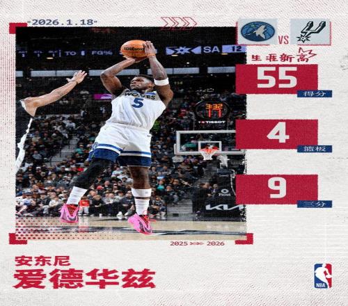 此役,爱德华兹缺阵两场后复出,出战40分钟33投19中,三分线外16中9罚球10中8,砍下生涯新高55分另有4篮板3助攻,其中第四节狂飙26分。