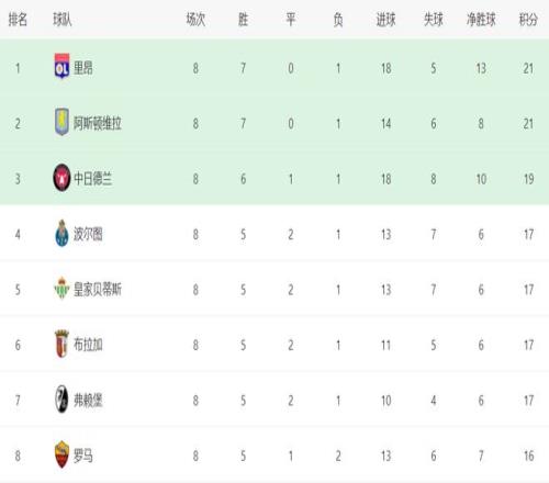 至此,欧联杯16强已经决出8个名额,排名前8的球队直接晋级,包括:里昂、阿斯顿维拉、中日德兰、波尔图、皇家贝蒂斯、布拉加、弗赖堡和罗马。