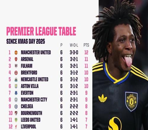 圣诞以来没有英超球队胜率超过50%,曼联拿12分最多